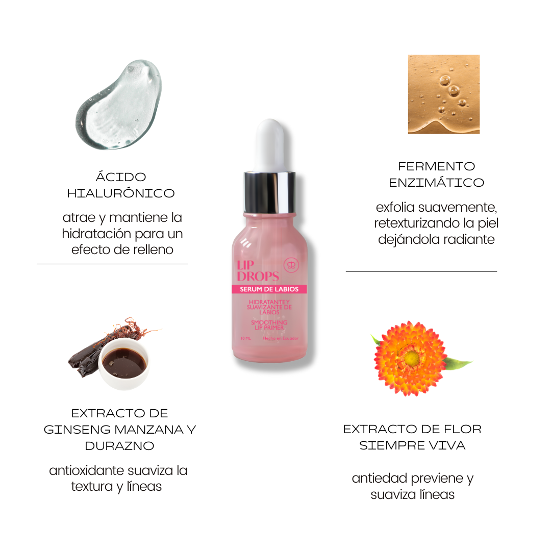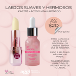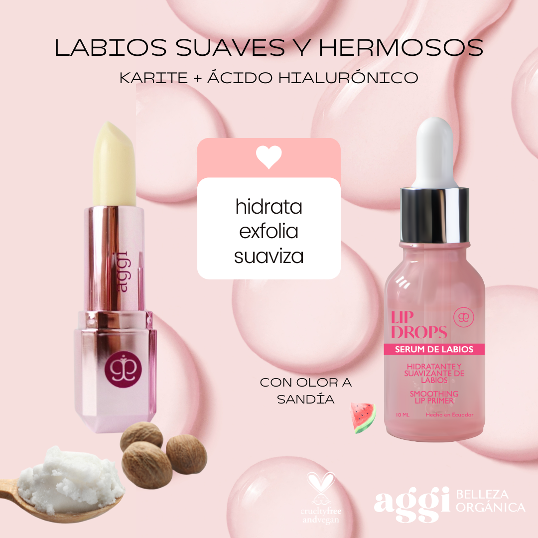 Incluye 1 bálsamo de karité y 1 serum de labios lip drops 10ml
